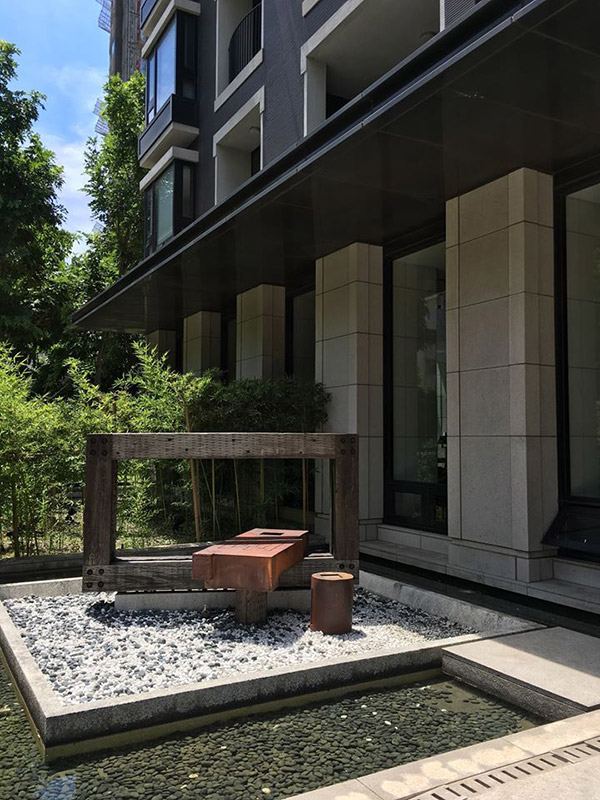 將長者的童年記憶,融合原木、燒陶、小石的元素,