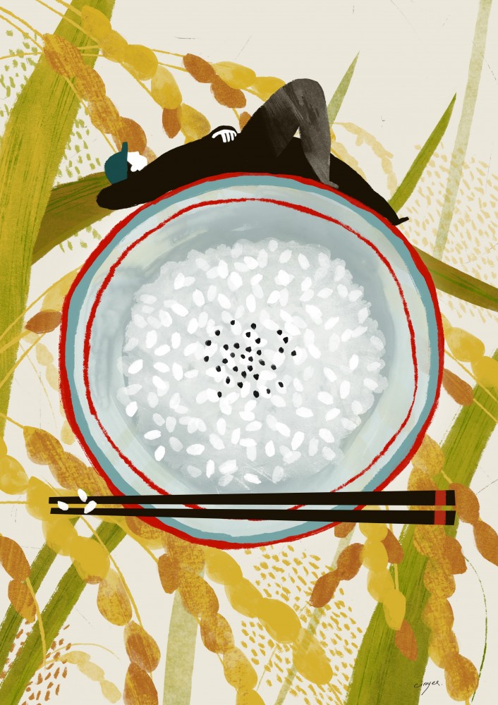 插畫以稻穗為背景,一碗飯為前景,碗上躺倒著休息的人,