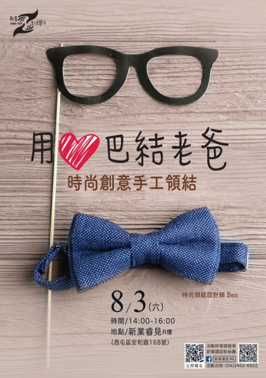 8/3(六) 下午2:00 - 4:00 時尚創(chuàng)意手工領(lǐng)結(jié)DIY