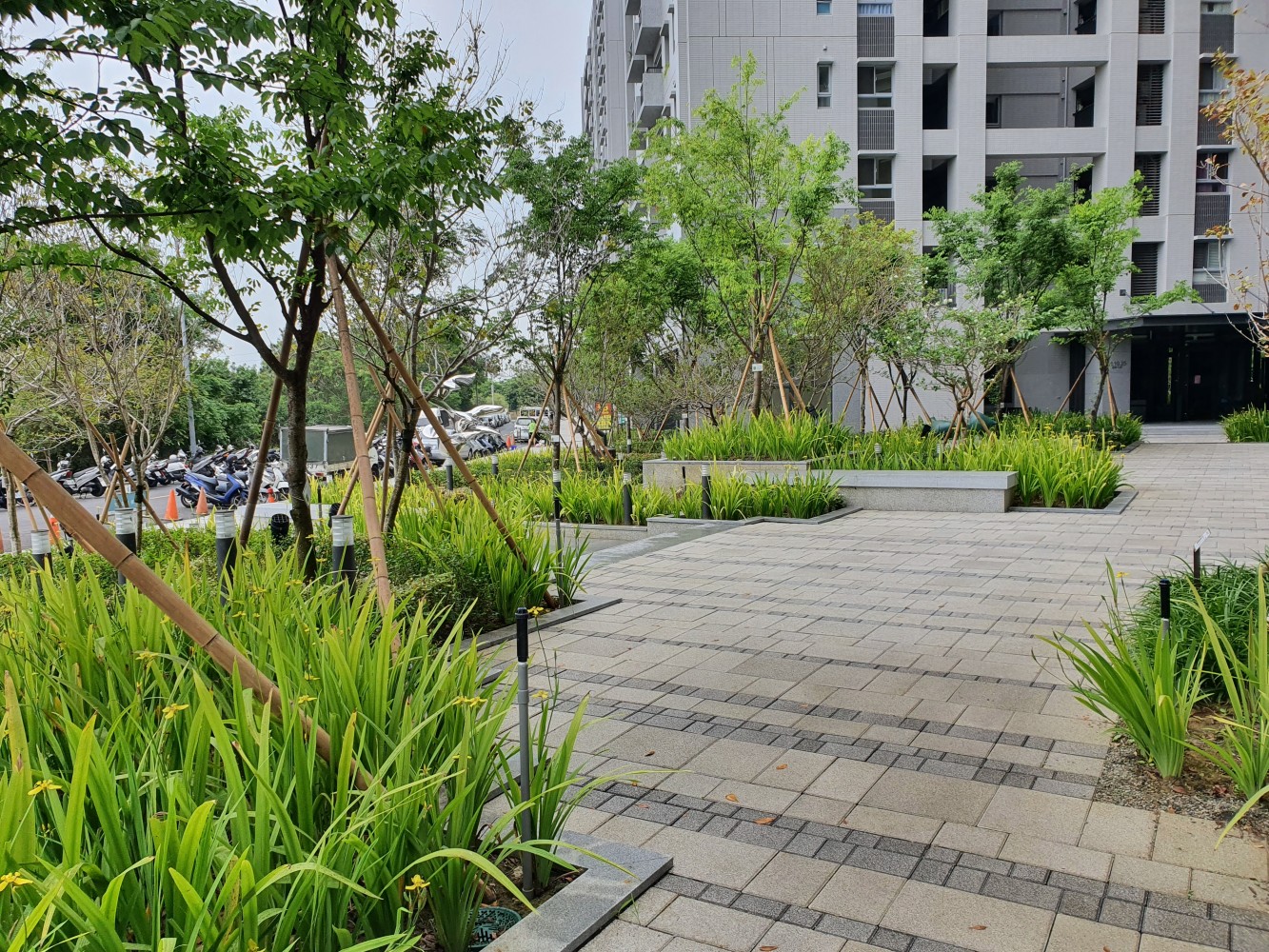 人行道使用透水磚,讓土壤保水,
