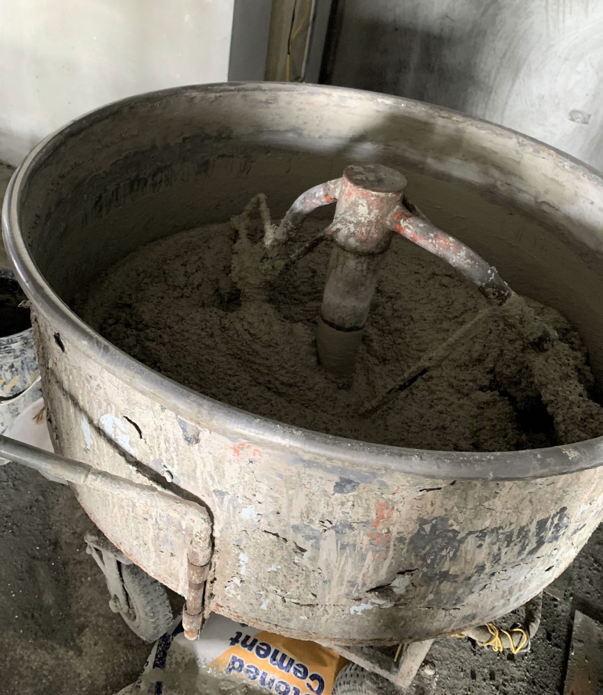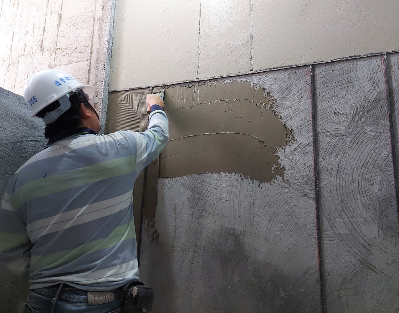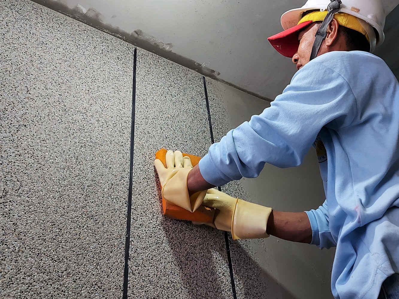 將混合的抿石子一遍遍在牆面抹開,