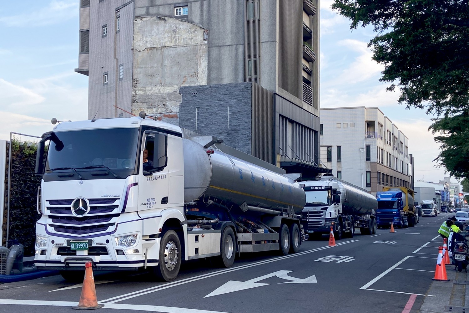一輛輛大型水車,在築願景工地旁排成一線,